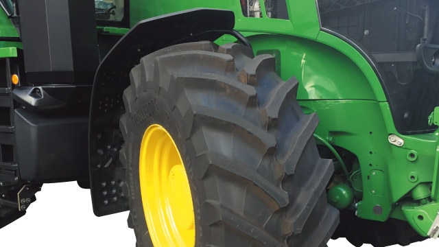 油圧シリンダー①とアキュムレータ付きのバルブ②を装備。路面追従性に優れ、安定した走行とけん引力を発揮します。