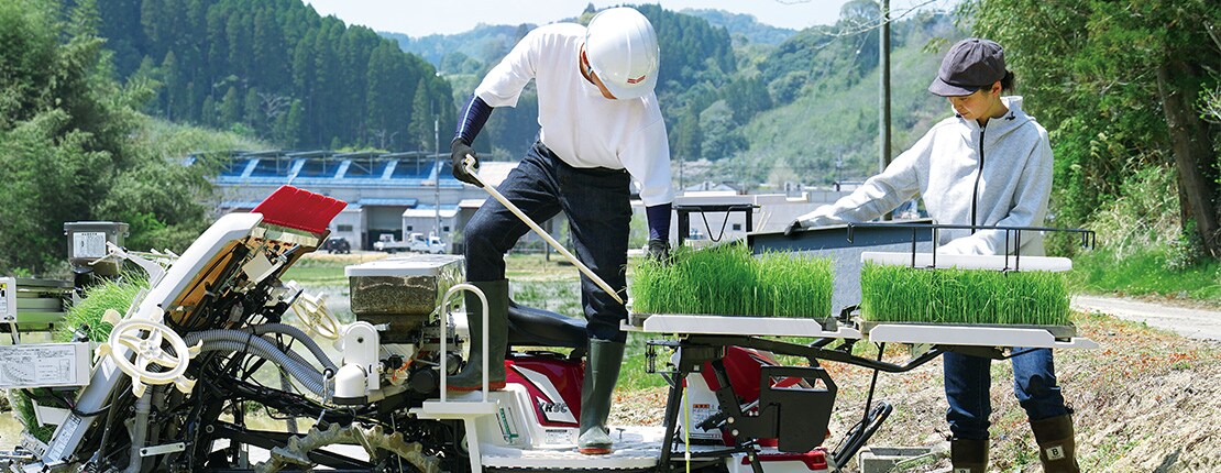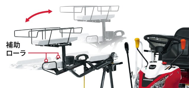 段済みの状態をレール状にのばすと補助ローラがせり上がり、軽い力でスムーズに苗を送れます。苗補給時の補助者とオペレーターの労力を軽減できます。