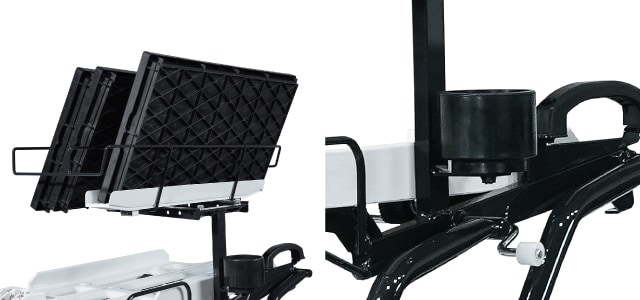苗補給時に空苗箱を5枚まで置ける便利なラック。ドリンクホルダもあり、快適に作業ができます。