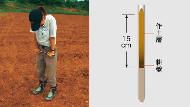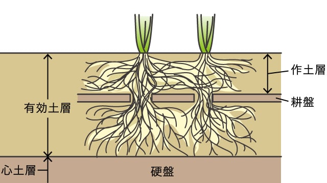作物の根が伸びることができる土層です。耕盤を破砕し、根が伸びることができれば有効土層も広がります。