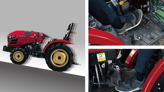 作業中でも走行中でもブレーキペダルを踏み込むだけで停止。クラッチペダルを踏み込む必要がありません。