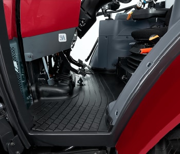 足元は段差をなくし、広い平面スペースを確保。足の置き場や動きをじゃましないので、長時間作業も疲れにくく快適。間口も広く、乗り降りがラクに。