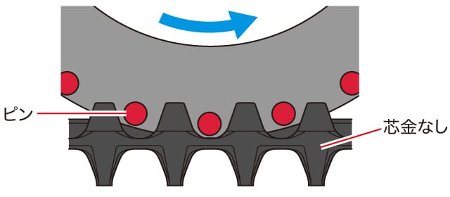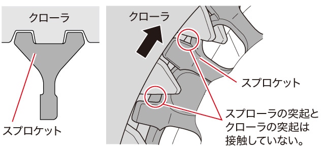 軽負荷時はクローラの芯金とスプロケットが直接金属接触しない駆動方式を採用。重負荷時はスプロケットの突起部でクローラの突起を押し、トルクをしっかり伝達します。