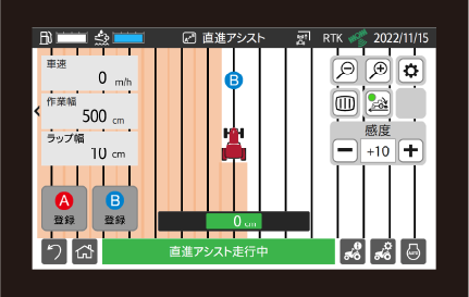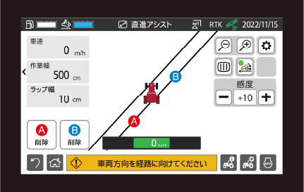トラクターが作業終わり(B点)まで10m以内になると、モニター上に表示されるとともにブザーが断続でお知らせ。5m以内になると連続音となります。