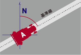 トラクターの位置(A点)と基準角度の設定から基準線を作ります。