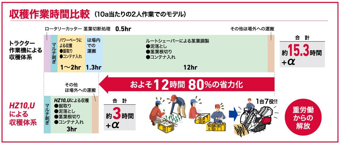 収穫作業時間比較(10a当たりの2人作業でのモデル)