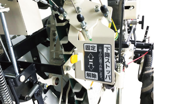 ほ場での休憩やメンテナンス時などに、機体高さを維持したままにしておく、機体下降ストッパを装備しています。