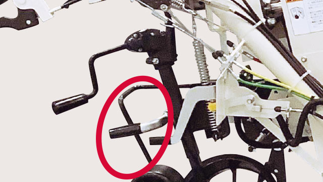 前後輪が同時に上下するので、ほ場ごとに前輪高さを調節する手間が省けます。また、旋回時は一定位置から機体後方側が前方に比べて高くなるので、ハンドルを押し下げた際に前輪が高い位置にきて、うねを崩しにくくなります。