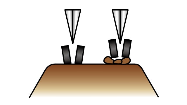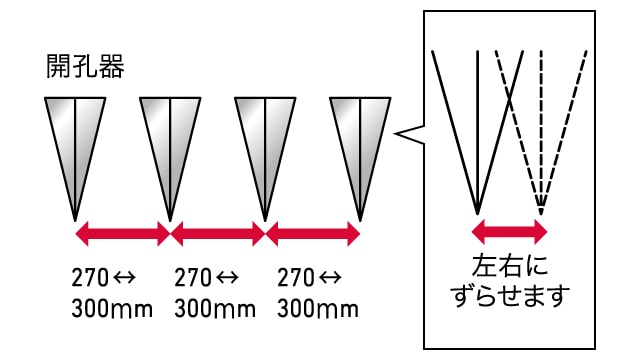 各開孔器の先端部を左右にずらすことができるため、270mmと300mmに条間の幅を調節できます。
