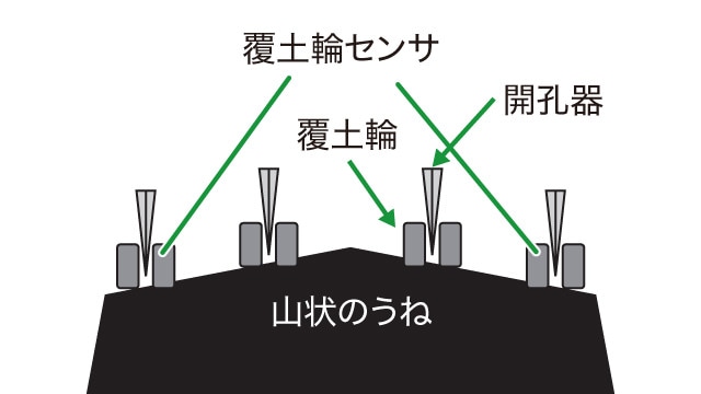 覆土輪センサが反応して、うね面に対して機体が自動で平行を保つので、植付深さが均一になります。