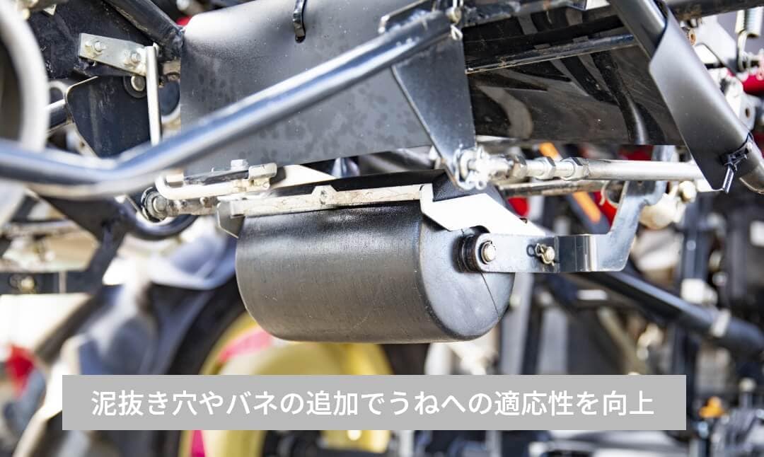 大きなうね溝の凹凸やうね高さの変化に追従し、植付深さを一定に保ちます。ローラ荷重は⼟の状態に合わせて3段階に調節できます。