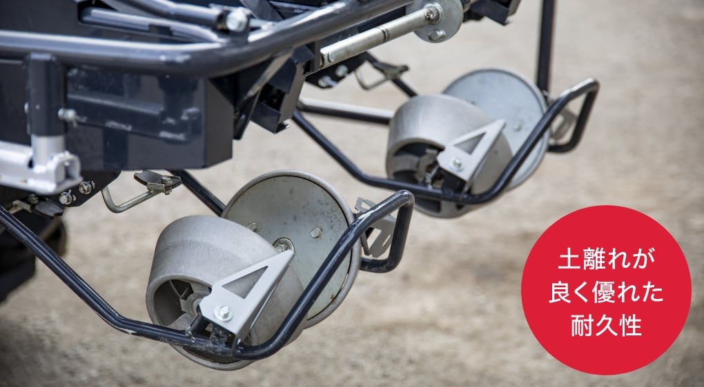 覆土ローラにカバーを装着。内部に土がたまらず、安定した覆土が継続できます。また、ローラの間隔は土壌条件に応じ3段階に調節できます。