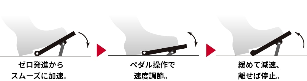 ペダルの踏み具合だけで発進・停止・加減速ができるので、両手でハンドルを握り、前を向いたまま安心して作業ができます。
