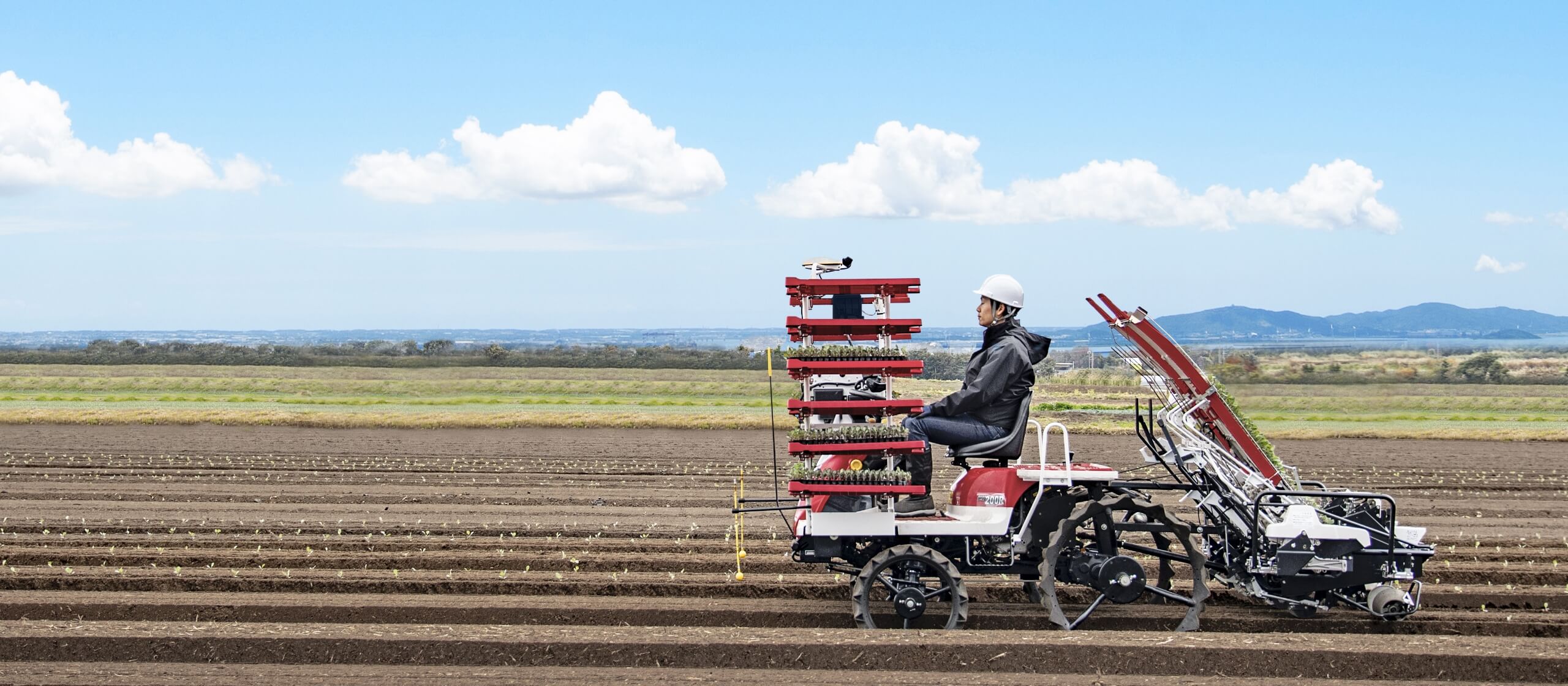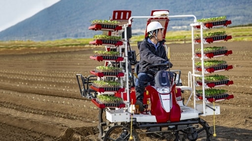 歩行型全自動野菜移植機の約2倍の高能率作業でキレイに植付けができます。