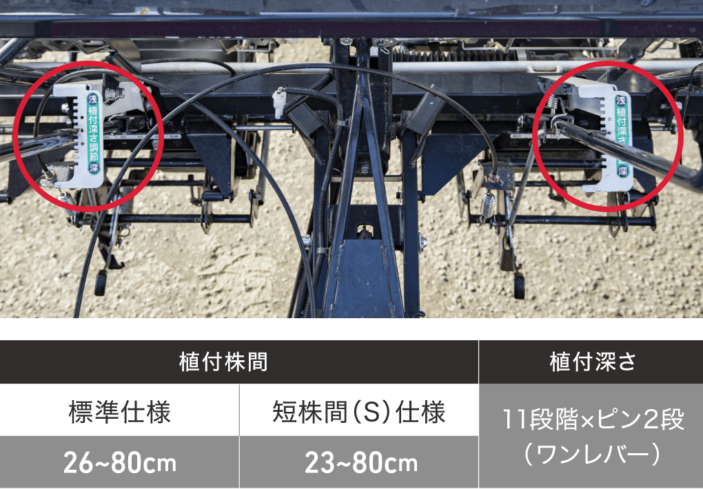 作物に応じた株間の選択や、ほ場の条件に応じた植付深さが、運転席から調節が可能です。