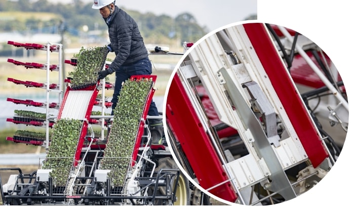 野菜トレイをセットするだけの全自動同時2条植え。