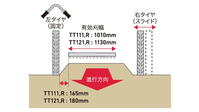 | 販売型式名 | 有効刈幅(mm) | 左タイヤ内から刈刃までの距離(mm) |