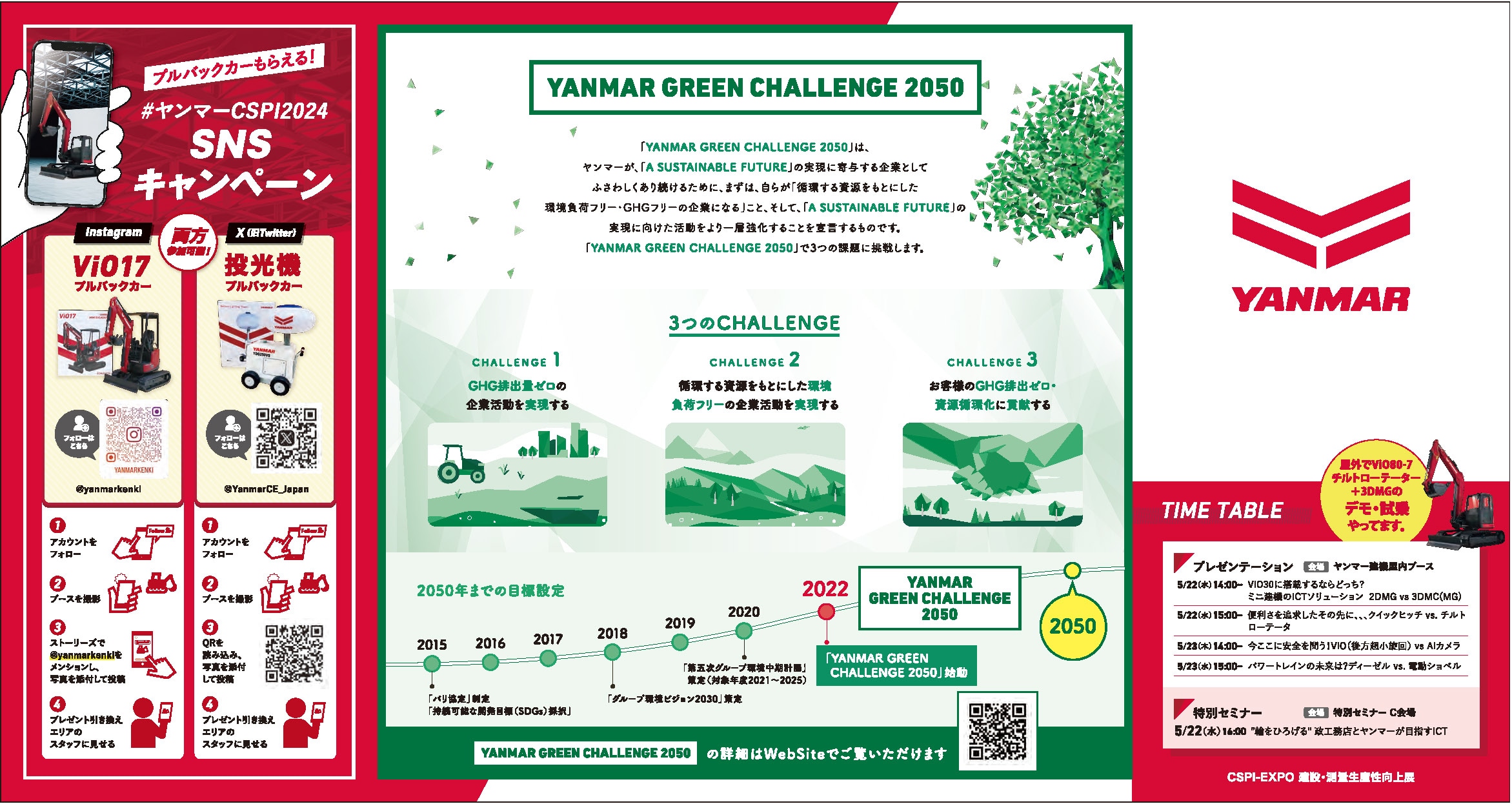 パートナー企業と協業し、通常届かない作業範囲までカバーすることができるアタッチメント「チルトローテータ」や、手軽な2Dから本格的な3Dの施工まで可能にする「マシンガイダンスシステム」を、「ViO30-7」「ViO35-7」に装着し展示し、生産性の向上や省人化など、お客さまにとって必要な価値提案を行います。また、5月22日(水)と23日(木)の両日、当社社員によるプレゼンバトルを開催し、ブース来場者による投票で「みんなの欲しい商品」を決める企画を行います。商品を知り尽くした社員のプレゼンを通じて、お客さま一人一人の課題に合ったソリューション検討の機会を提供します。