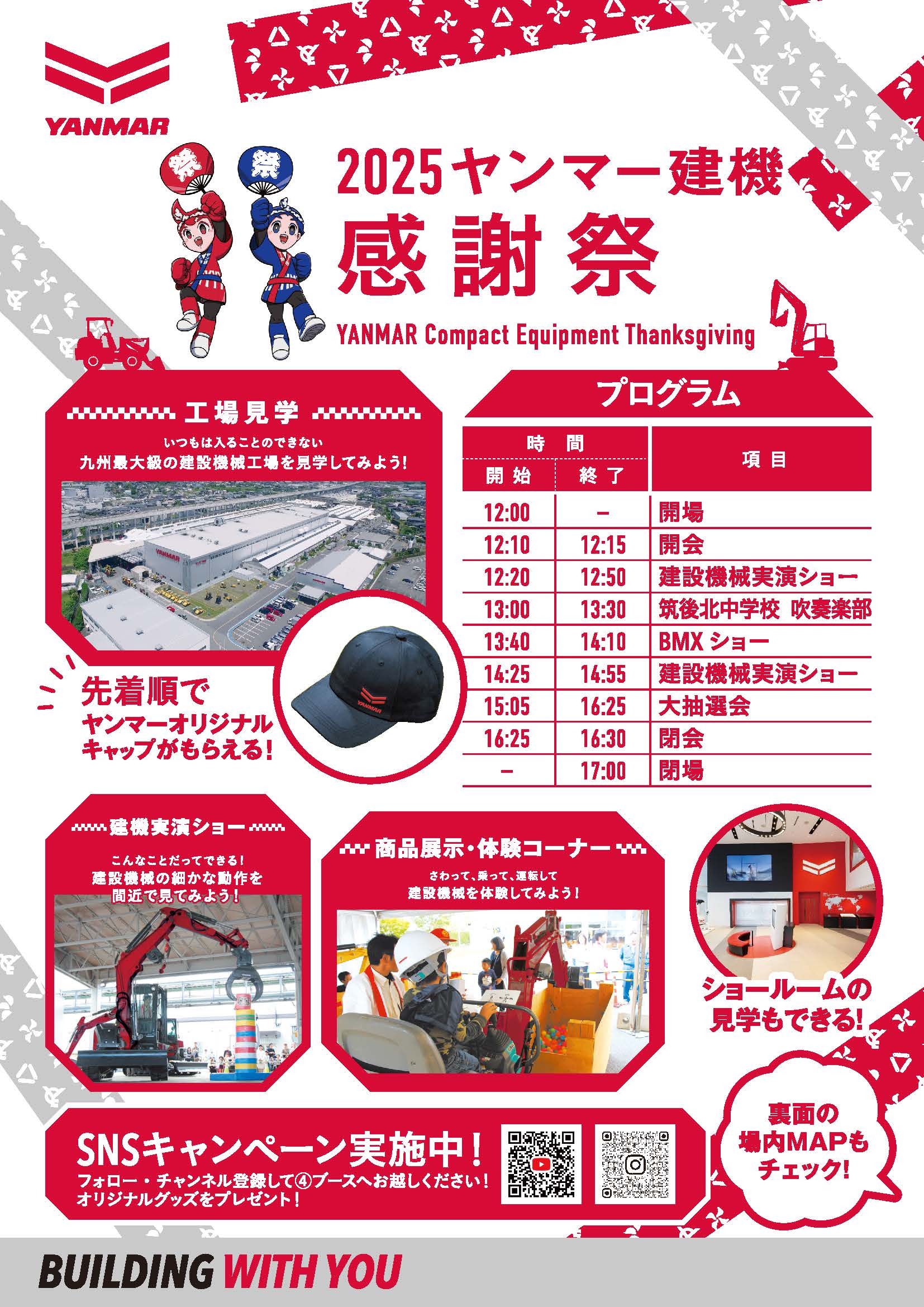 ヤンマー建機では、本社を構える福岡県筑後市の皆様をはじめ、日頃からご理解・ご協力を頂いております近隣住民の皆様への感謝の気持ちを込めて、ヤンマー建機感謝祭を開催いたします!