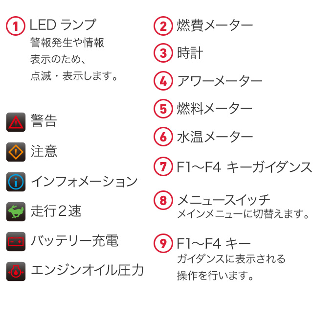 様々な必要情報や稼働状況をわかりやすく表示。バックライト付きなので夜間でも見やすく、異常時などはランプとブザーでお知らせします。