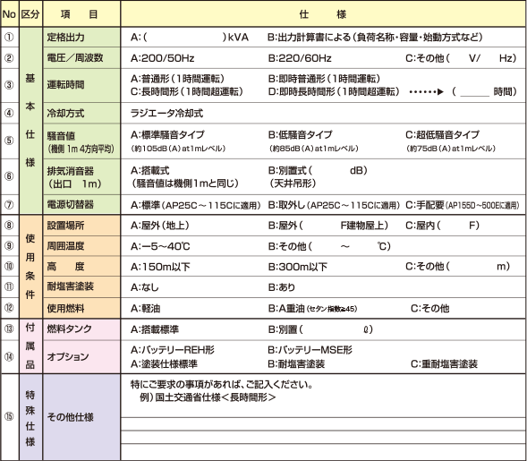 ご照会の際には、標準仕様をご参考のうえ次の事項について、ご指示願います。
