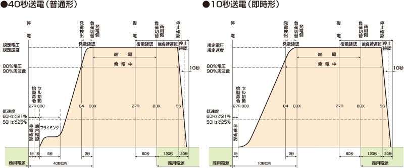 - ※自動保守運転中に商用電源が停電しますと、自動的に給電状態に移行し自動運転を継続します。 また、復電しますと、自動的に停止して待機状態に戻ります。