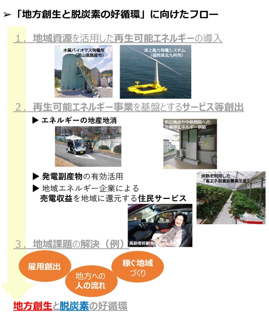 「地方創生と脱炭素の好循環」に向けたフローをご紹介します。まず、地域特有の資源を活用して、地域にあった再生可能エネルギーを導入します。エネルギーサービス事業を通して地域に還元するための仕組みを生み出します。例えば、エネルギーの地産地消、発電副産物(廃熱、液肥など)の地域内有効活用、地域エネルギー企業による電力供給サービスなど様々な取組みが考えられます。