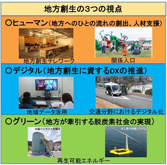 「まち・ひと・しごと創生基本方針2021」には地方創生の3つの視点が記載されています。地方へのひとの流れの創出や人材支援に着目した施策「ヒューマン」、地域の課題解決や魅力向上に資する地方におけるDXに向けた施策「デジタル」、地方が牽引する脱炭素社会の実現に向けた施策「グリーン」です。