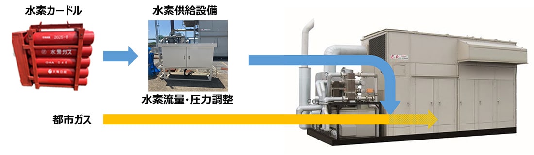 今回の実証運転試験は、既に都市ガス用として販売しているヤンマーエネルギーシステム製のコージェネレーションシステム「EP400G」を対象に、Daigasエナジーが水素供給設備によって流量・圧力調整を行った水素を使用して行いました。水素供給設備部分を除くハードウェアや制御ソフトを変更せずに、都市ガスのみで 運転した場合と同等の低NOXと安定燃焼を確認しました。
