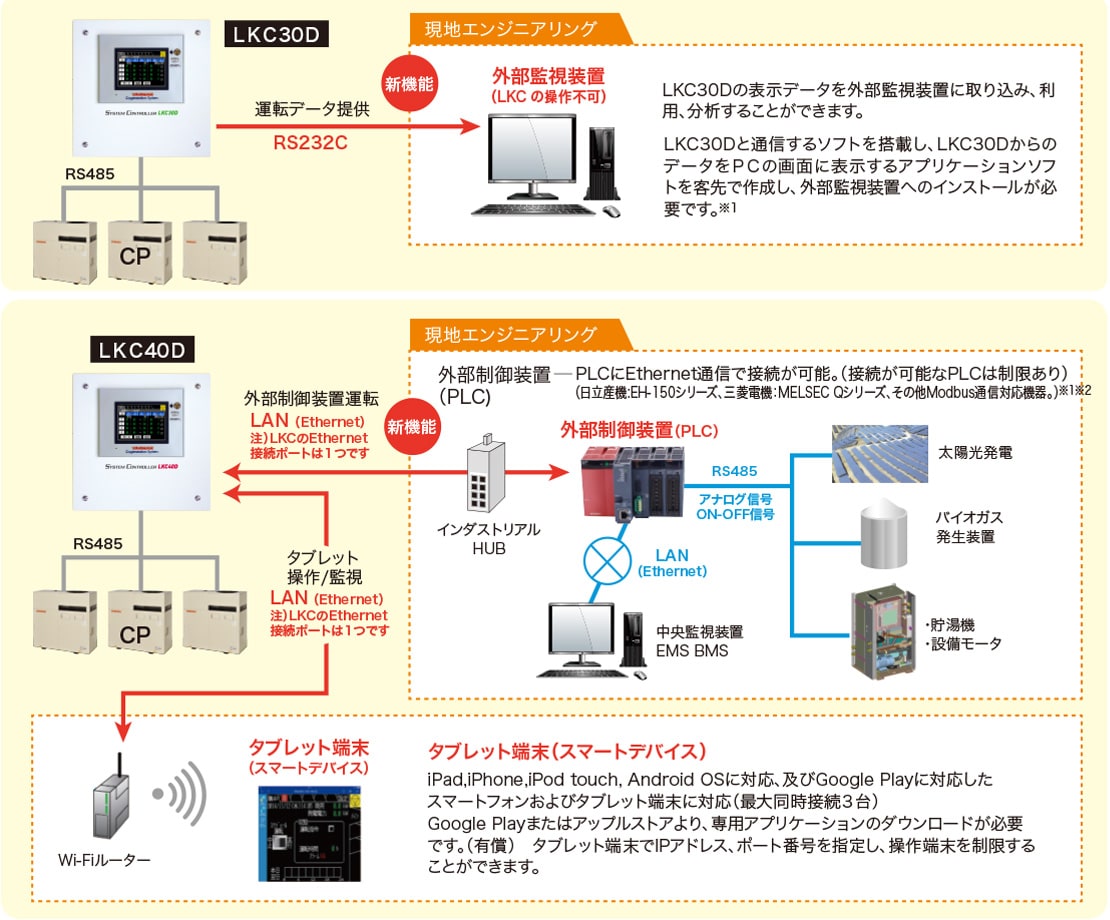 | 外部機器との接続機能 | 外部監視装置(PC)等に運転データを取り込み、利用することが可能 ※1、※2(RS232C通信) | ① タブレット端末 ※4にLKC30Dと同じ画面を表示、操作することが可能。(LAN通信) | |