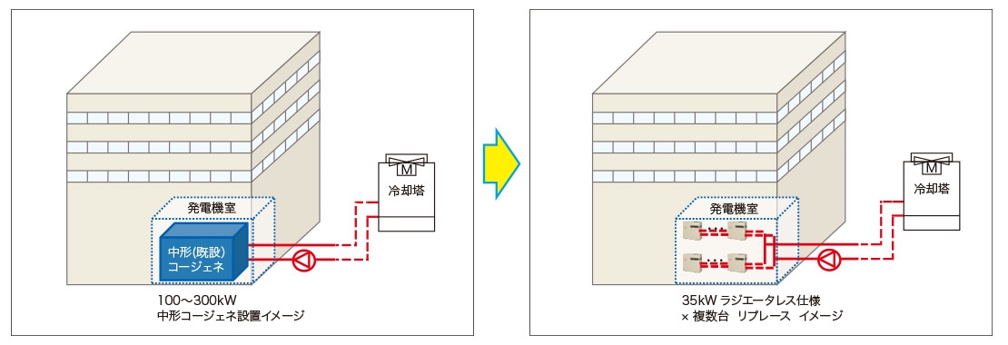 既設100~300kW中形コージェネのリプレースが25、30、35kWの複数台設置で対応可能です。