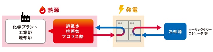 排温水、排蒸気、プロセス熱、排気ガス、ジャケット水など様々な熱を発電に利用できます。