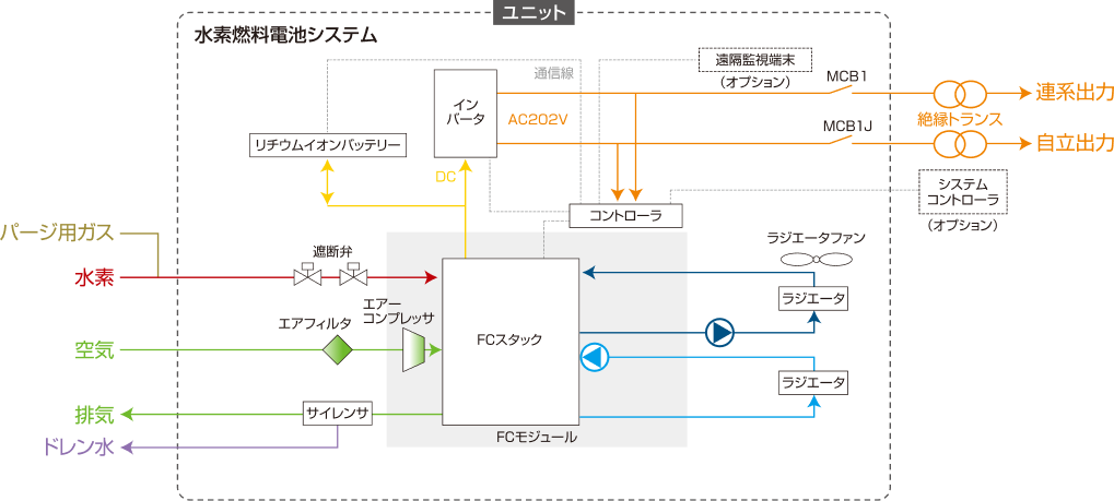 燃料電池の特徴を生かした低騒音・省スペースのオールインワン発電システムです。