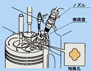 燃焼室内の空気流動を実験的、解析的に究明することにより、ヤンマー独自の特殊噴口形状の持つ空気の混合効果をさらに向上させました。これにより、空気がさらに有効に利用され、燃焼がクリーンに、排ガスエミッションをさらに低減することができました。