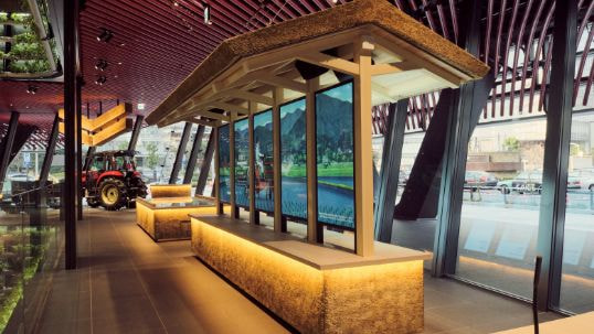 ⽶の⽣産時に発⽣する「稲藁」は、屋根材に使われることで⼈々の⽣活を守り、腐熟化すると⽶作りの肥料として活⽤される、⾷糧⽣産を通じて⾃然と⼈の豊かさが両⽴し、その循環を象徴する素材です。