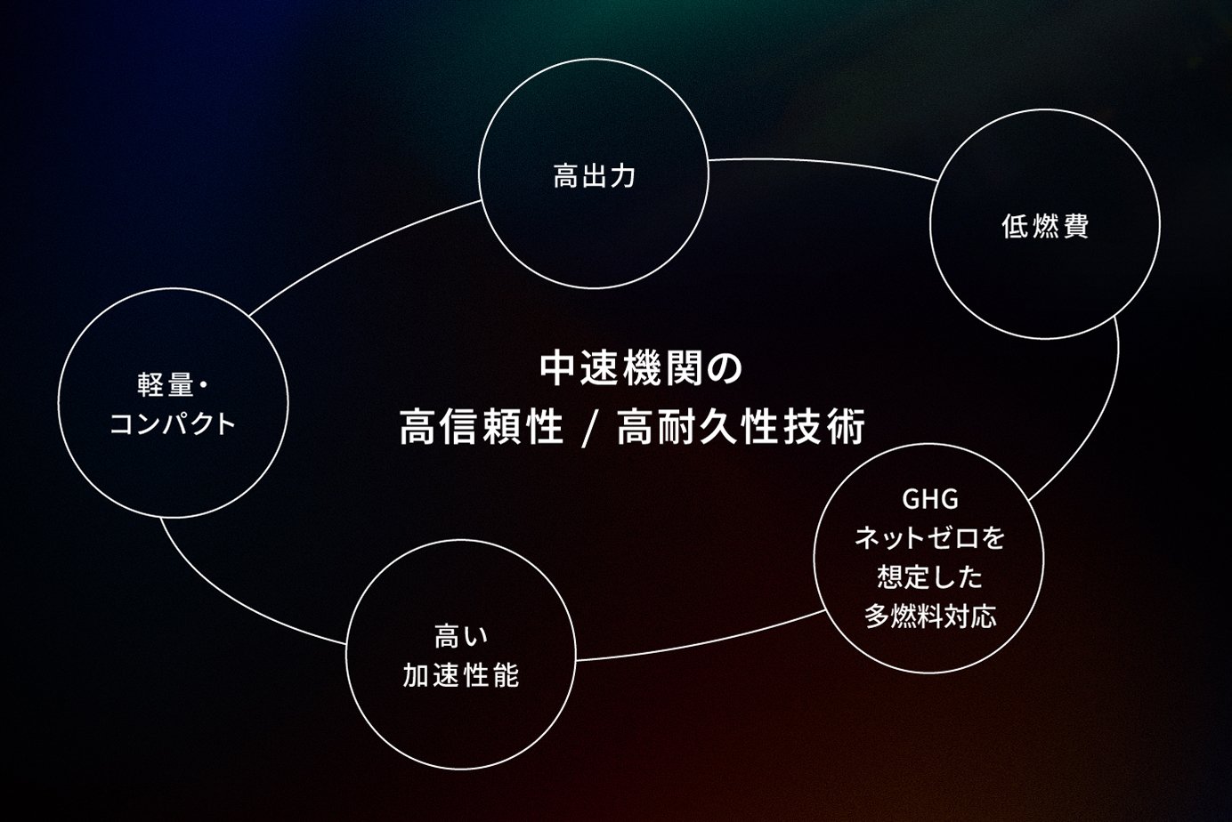 これまでヤンマーが培ってきた、中小形高速機関開発のノウハウと、大形中速機関の高い信頼性/耐久性の技術を用いて開発を進めています。