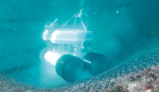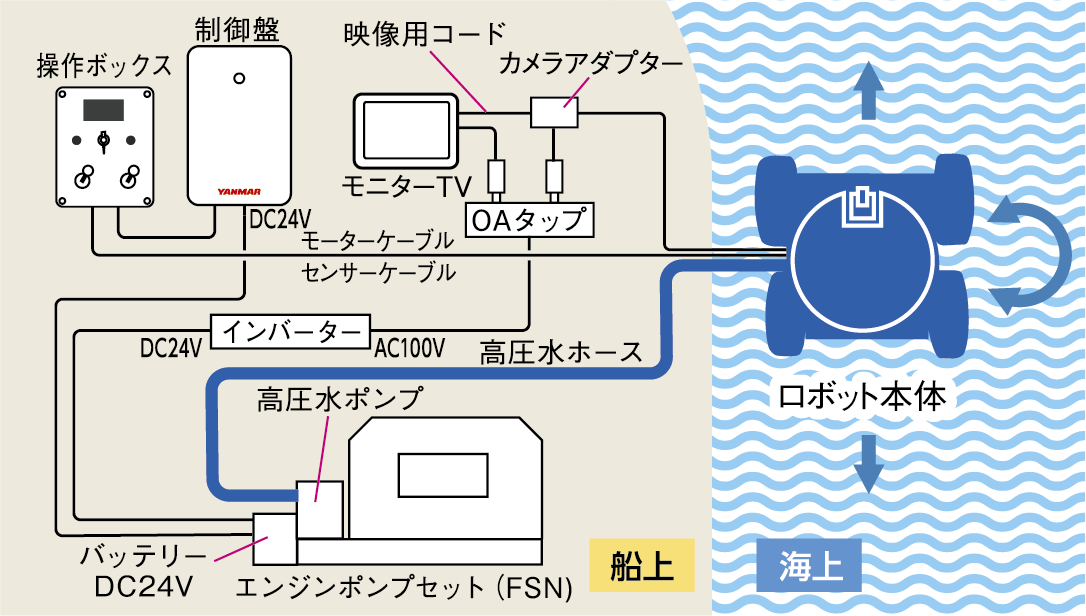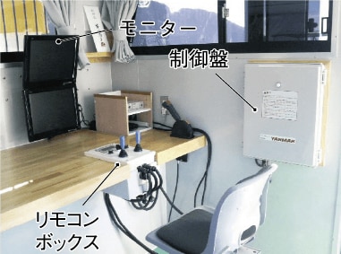 リモコンボックスのレバー操作で、洗浄ロボットが自在に操れます。また水中のイケス網のチェックも、モニター画面でリアルタイムで行えます。