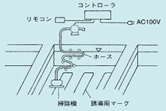 「かす兵衛」がセンサーで感知して走行する経路の誘導マークは、水槽の条件に合わせて描けます。掃除部が走行できる水槽であれば、形状・大きさにかかわらず自動化でき、作業能率の向上がはかれます。また、誘導マークがなくてもリモコン操作で底掃除が行え、充電やめんどうな操作も不要です。