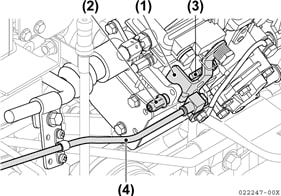 - 点検確認でコントロールレバーが、高速側の制限ボルト(2)または、低速側の制限ボルト(3)に当たっていない場合には、両方が当たるようにリモコンケーブル(4)の取付金具のねじをゆるめ、固定位置をずらして調整します。