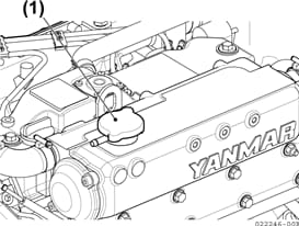 サブタンク内の水量が下限目盛りより少ない場合、エンジンの冷却水タンクの給水口(1)(フィラーキャップ)を開けて水量を点検し、水量が少ないときは、きれいな軟水を補給します。