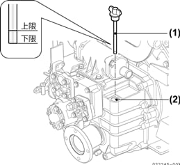 - 油量が不足している場合は、指定の潤滑油を給油口(2)より補給します。