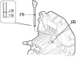 - 油量が不足している場合は、指定の潤滑油を給油口(2)より補給します。