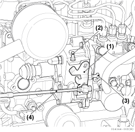 - 点検確認でコントロールレバーが、高速側の制限ボルト(2)または、低速側の制限ボルト(3)に当たっていない場合には、両方が当たるようにリモコンケーブル(4)の取付金具のねじをゆるめ、固定位置をずらして調整し ます。はじめに高速側の制限ボルトの位置をあわせてから低速側のアイドリング回転を調整します。