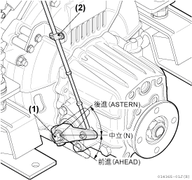 - リモコンハンドルをN(中立)、AHEAD(前進)、ASTERN(後進)の位置においたとき、クラッチのシフト レバーがそれぞれ正しい位置にあるかを確認します。