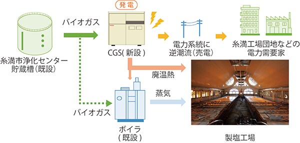 本事業は、糸満市浄化センターの下水処理工程で発生するバイオガスを燃料とし、コージェネレーションシステム(CGS)を用いて発電を行い、発電した電気を、再生可能エネルギーの固定価格買い取り制度(FIT)を活用して売電するものです。また、売電する電力については沖縄ガスNPを介し、糸満市工業団地の需要家などへ供給するとともに、発電時の廃熱から温水を作り、青い海の塩製造工程において有効活用することで、地域の恵みを地域に還元しながら、環境負荷の低減を実現します。