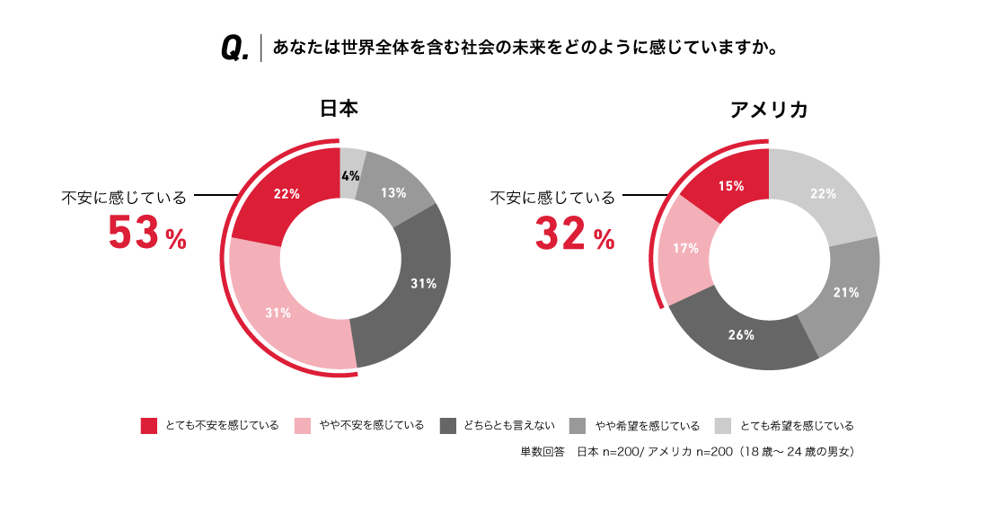 自身の未来に対し「とても不安を感じている」「やや不安を感じている」と回答した次世代層は、日本では46%と約半数にのぼる一方、アメリカではわずか18%に留まりました。また、世界全体を含めた社会の未来に対し、「とても不安を感じている」「やや不安を感じている」と回答した人は、日本では53%、アメリカでは32%となり、自身や社会の未来の見通しに日米で大きな差があることが明らかになりました。