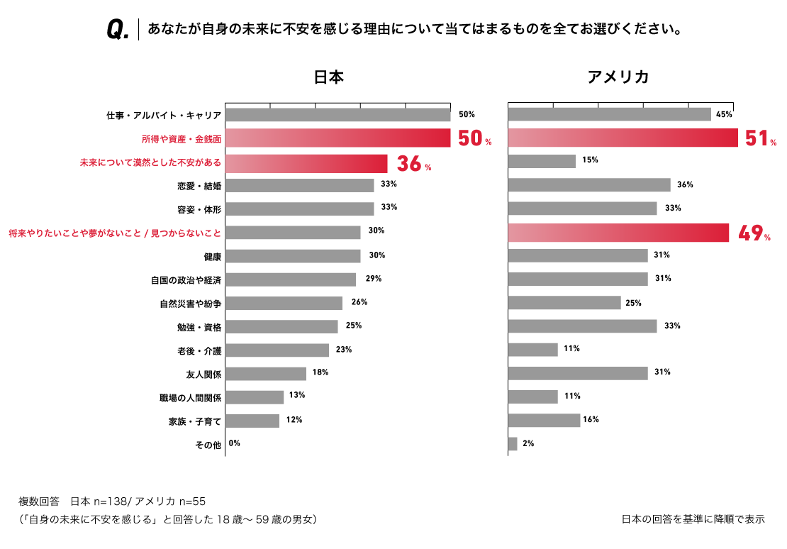 自身の未来に関し不安を感じる理由は、日米共通して金銭面での不安を多く挙げています。国別で比較すると、日本では「漠然とした不安があること」、アメリカでは「将来やりたいことや夢がない/見つからないこと」が不安を感じる要因として多く挙げられており、アメリカでは、将来の夢ややりたいことが自身の未来への希望に大きく影響を与えていることが考えられます。