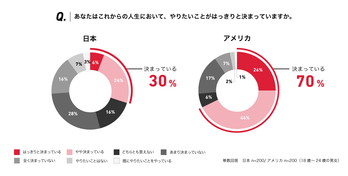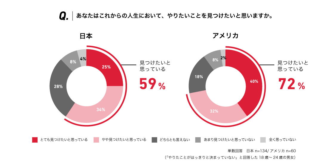 これからの人生においてやりたいことが「はっきりと決まっている」「やや決まっている」と回答した次世代層は、日本が30%に留まる一方、アメリカは70%と顕著な差がみられました。また、「まだやりたいことが見つかっていない」と回答した人でも、「将来やりたいことを見つけたい」と日本が59%、アメリカが72%回答しており、日米ともに自身の未来に対して意欲的に考えていることが明らかになりました。