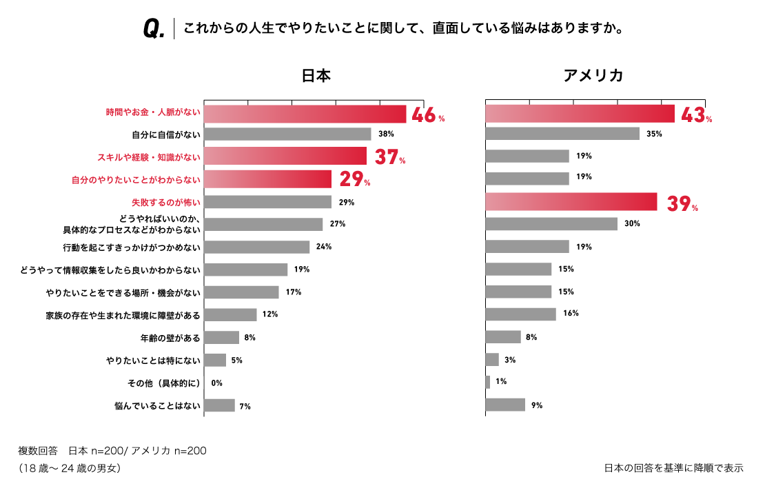 将来やりたいことに関する悩みについて、次世代層で最も多い回答は、日米ともに「時間やお金・人脈がない」となりました。国別に比較すると、日本ではスキルや知識といった「自分の能力」や「やりたいことがわからないこと」など実行する前に不安を感じており、アメリカでは「失敗するのが怖い」が上位の回答となり、実行を前提とした不安を抱いていることが明らかになりました。