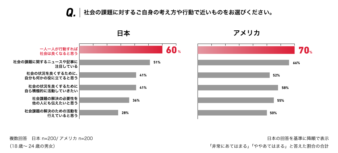 社会の課題に対する自身の考え方や行動で近いものについて聞いたところ、次世代層で日米ともに最も回答が多かったのは「一人一人が行動すれば社会は良くなると思う」で、日本では60%、アメリカで70%となりました。